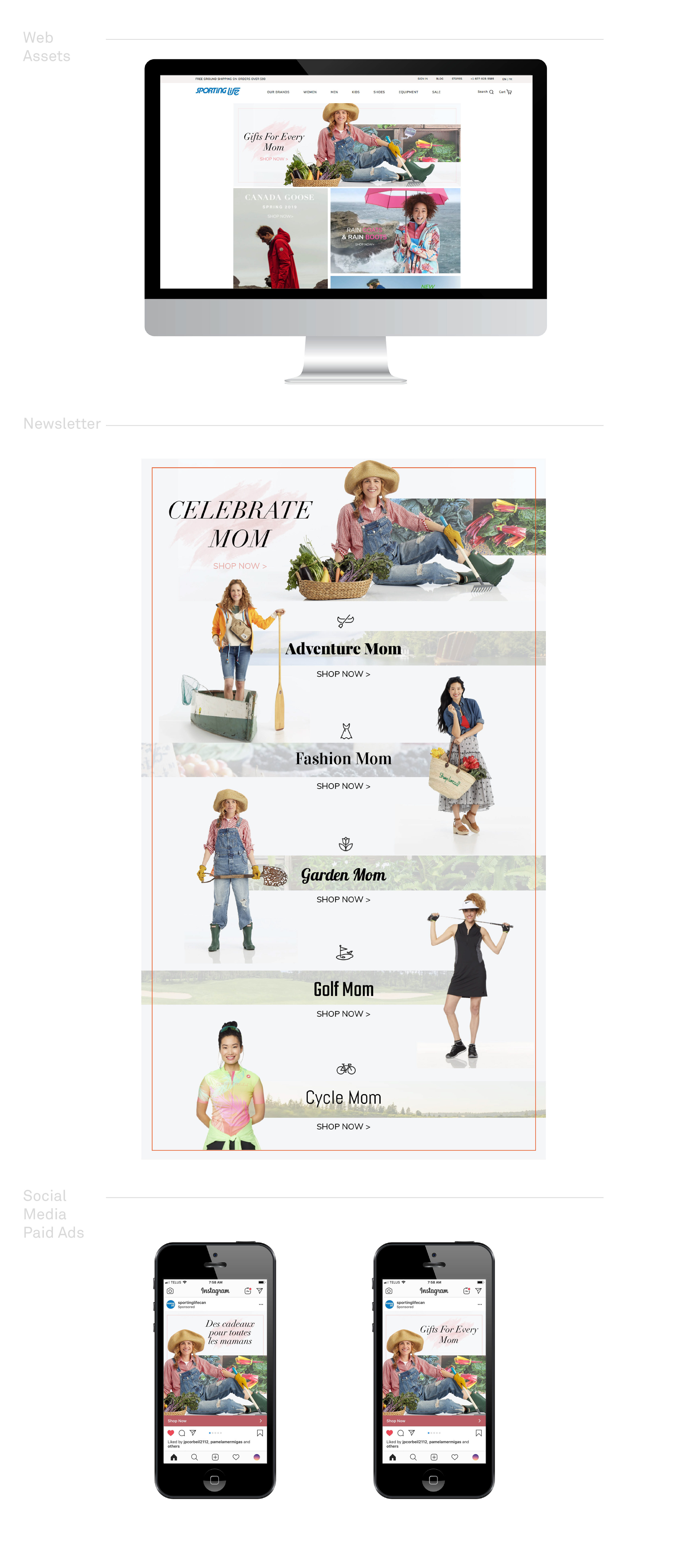 As Lead Designer & Marketing Coordinator at Sporting Life, the Mother's Day campaign was created with the customer base in mind. Work includes newsletters, web assets, social media paid ads & in-store signage.